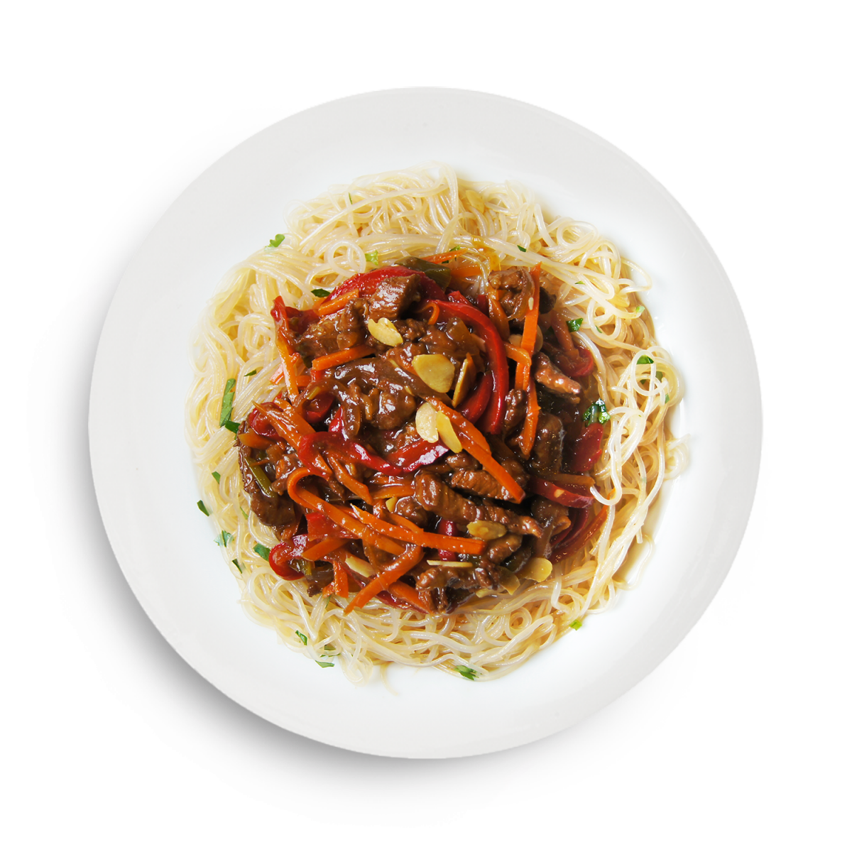 фунчоза отварная (рисовая лапша "Фунчоза", вода, соус устричный, масло подсолнечное, масло кунжутное, перец ч/м), индейка в соусе (бедро индейки с/м, вода, морковь св., лук репчатый св., перец болгарский, соус соевый, масло подсолнечное, крахмал кукурузный, сахар, соус соевый, лук зеленый, соус шрирача, кинза св., чеснок суш., имбирь молот.), кинза св., арахис жареный.