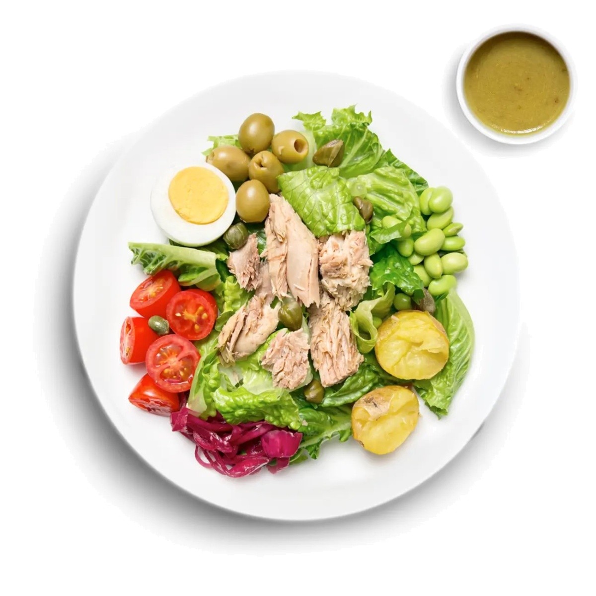 тунец конс., соус (масло оливковое, винный уксус, горчица ротисьер, горчица дижонская, сахар, вода), бобы зеленые с/м, картофель бейби отв.( картофель бейби св.), яйцо куриное маринованное, помидоры черри св., салат романо св., оливки конс., лук красный маринованный (лук красный св., вода, уксус столовый 9%, сахар, соль), каперсы конс.